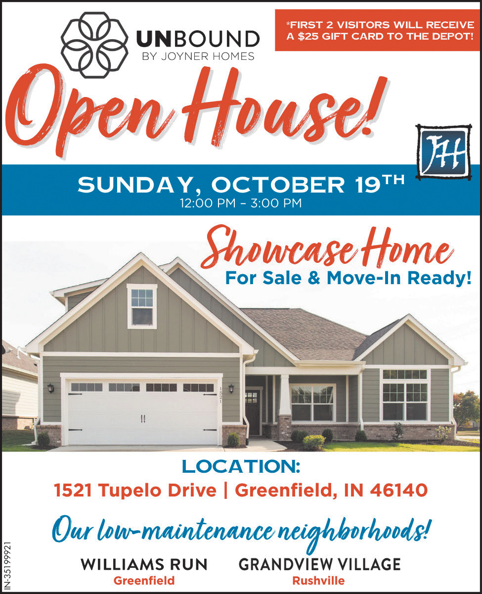 Oct 18, 2025. Unbound by Joyner Homes Open House! (October 19, 2025) Open Houses Ads from Greenfield Reporter