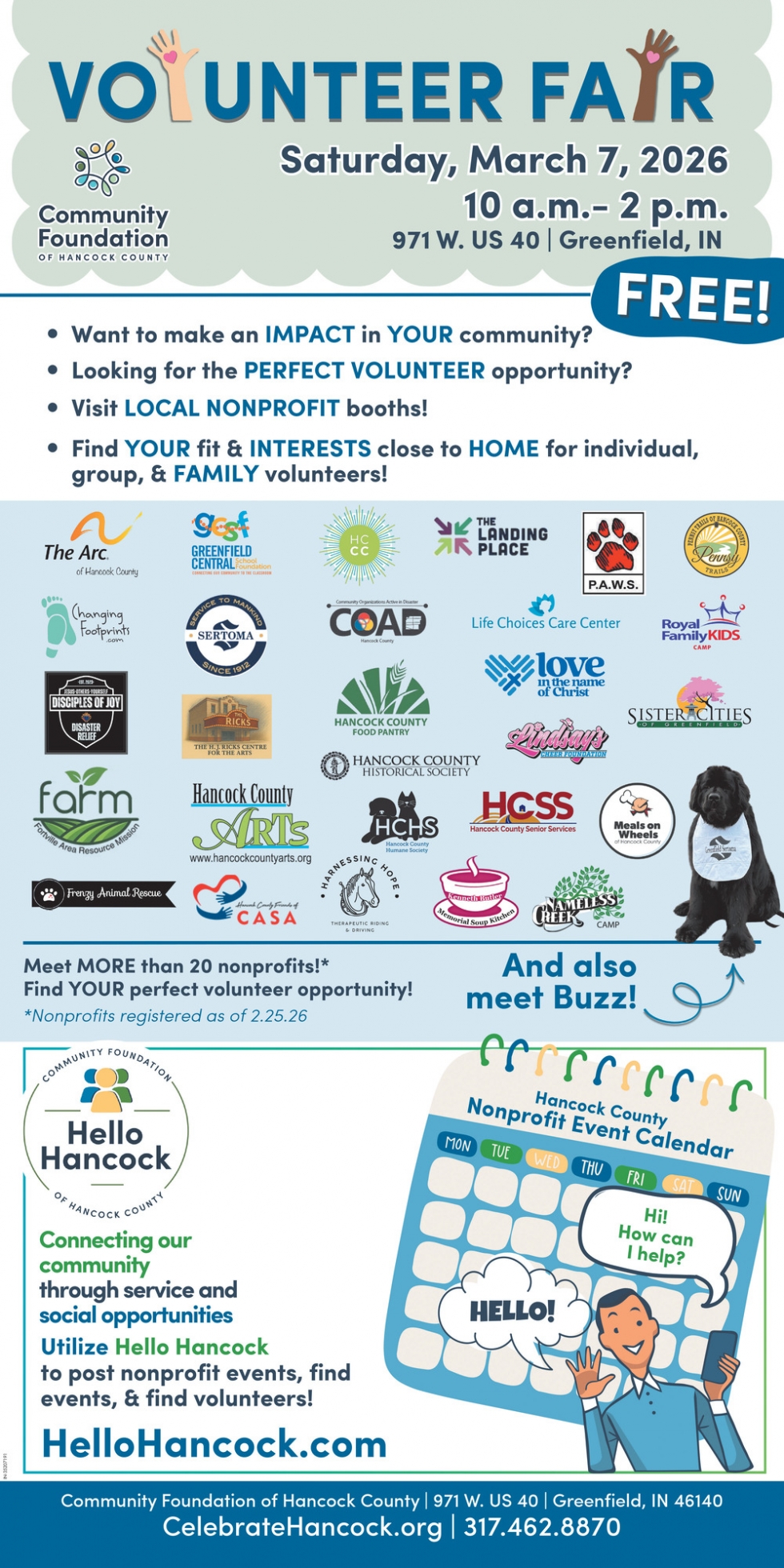 Feb 28, 2026. Community Foundation of Hancock County Volunteer Fair (March 7, 2026) Events Ads from Greenfield Reporter